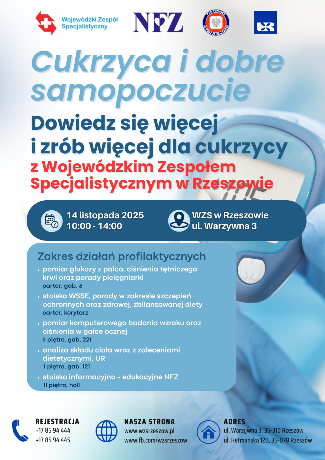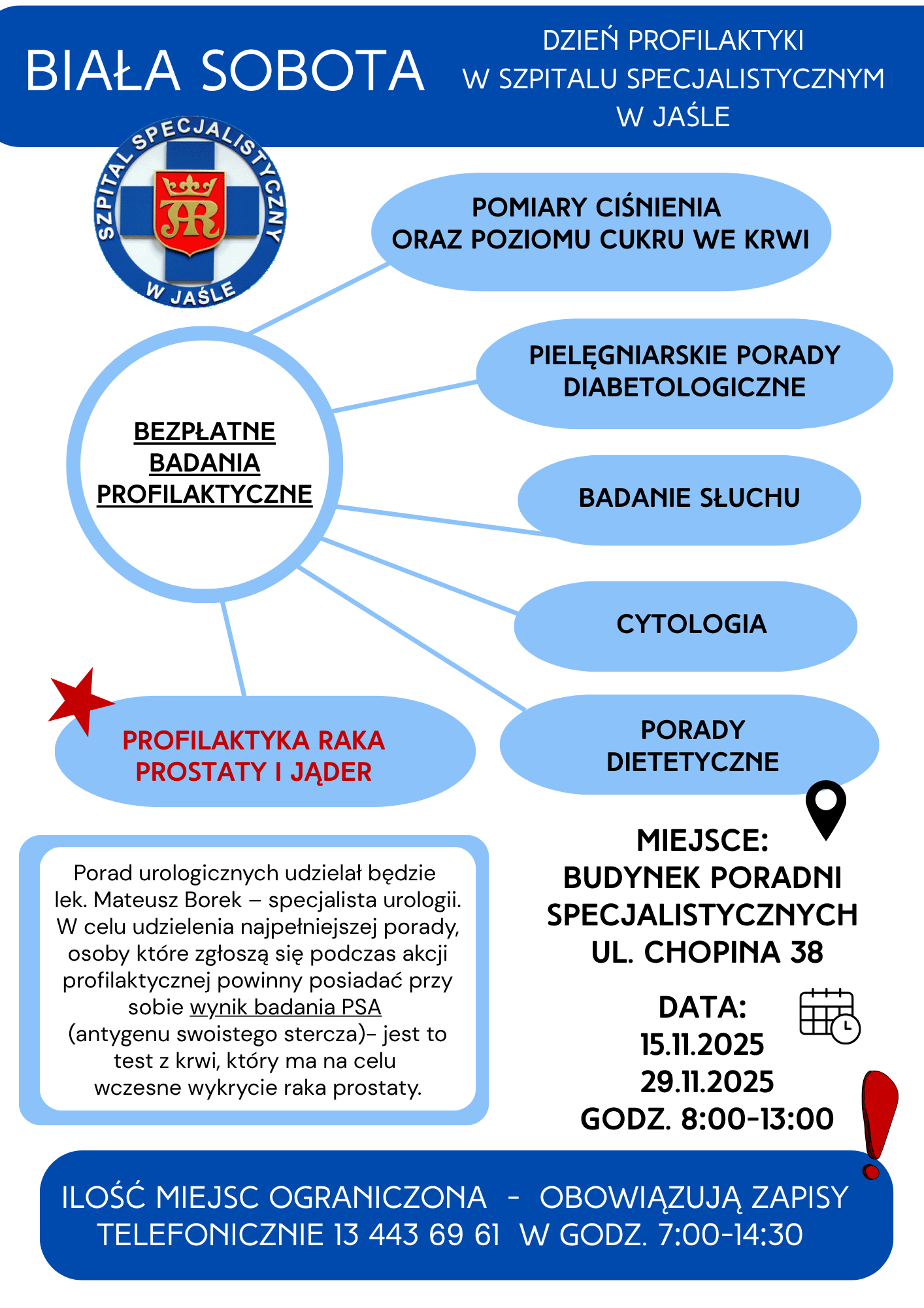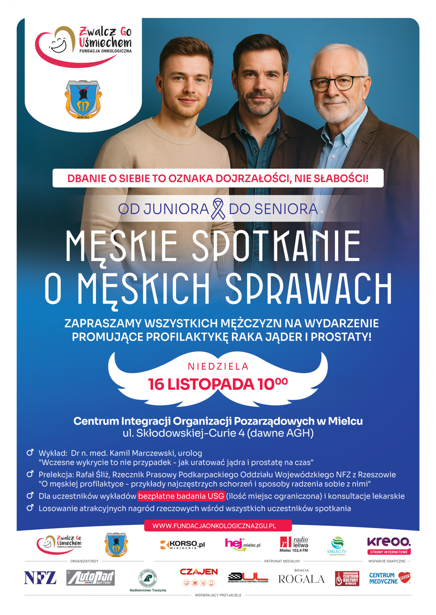 ➤ Listopad na całym świecie uznawany jest za miesiąc świadomości męskich chorób nowotworowych - Movember, zwłaszcza raka prostaty i raka jąder. W ramach tej inicjatywy Uniwersytecki Szpital Kliniczny im. Fryderyka Chopina w Rzeszowie organizuje akcje profilaktyczną poświęconą wczesnemu wykrywaniu raka gruczołu krokowego. Podczas wydarzenia planowane są: bezpłatne konsultacje z urologami, badania profilaktyczne, spotkania edukacyjne, stoiska informacyjne dotyczące profilaktyki zdrowotnej, działania promujące zdrowy styl życia.